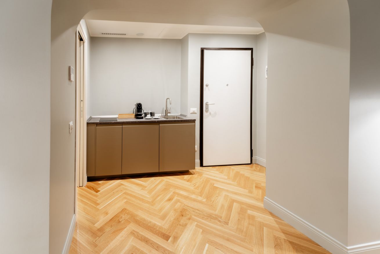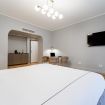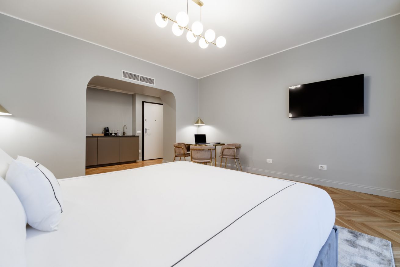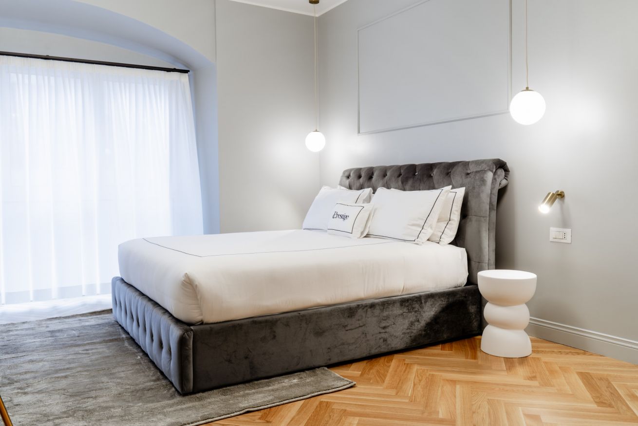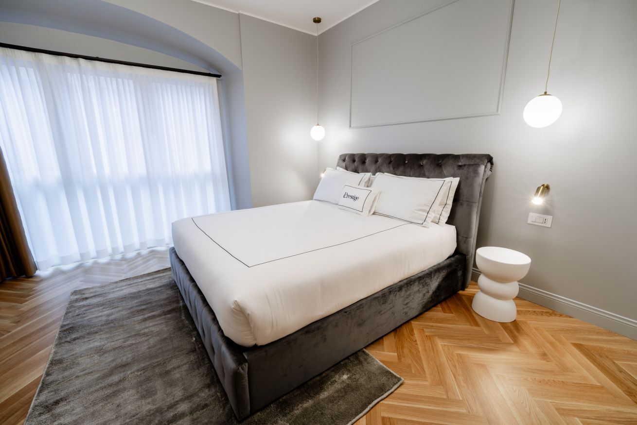 Favolosa suite di 25 mq con una camera da letto matrimoniale. Un bagno con il doppio lavandino e una doccia molto spaziosa.
