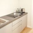 cottura attrezzato con frigorifero e macchina da caffè, e un bagno con doccia.